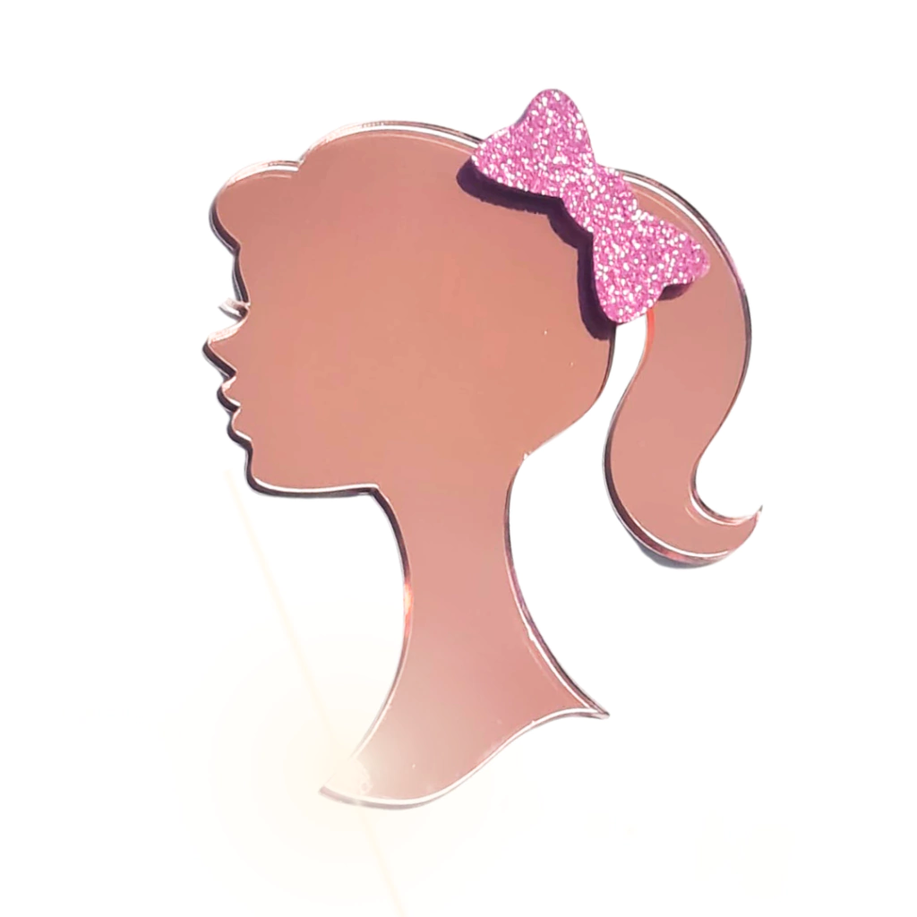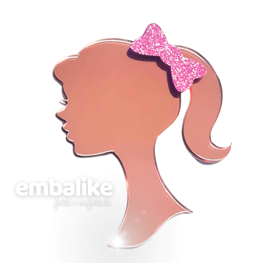 Aplique Espelhado Rosto Barbie Acrílico Rose Com Laço EVA Glitter 10cm
