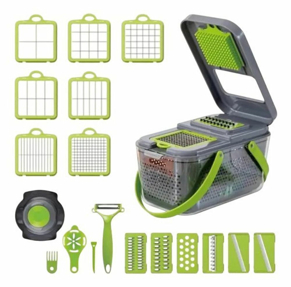 01 Conjunto Cortador e Ralador Multifuncional Manual 16 Peças - Cinza com Verde