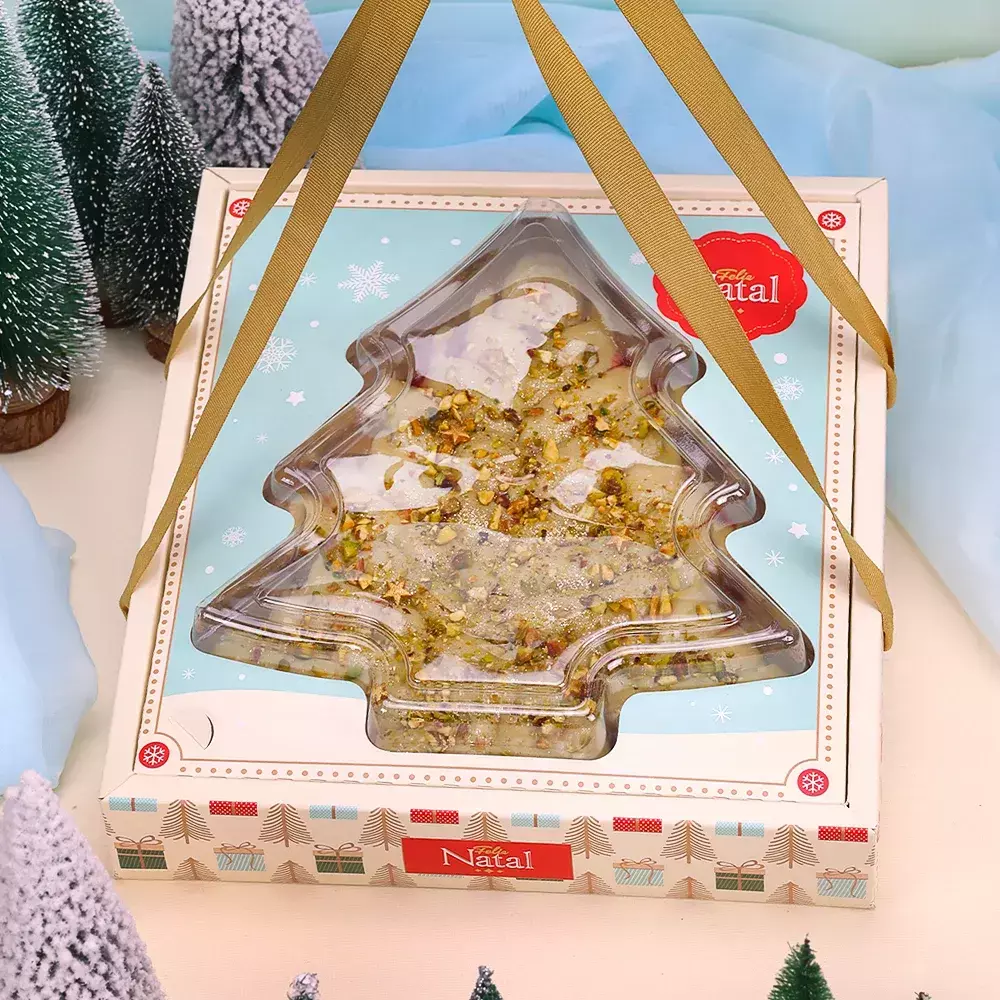 A parte externa da embalagem traz uma estampa delicada em azul claro com flocos de neve, transmitindo a atmosfera mágica do Natal.